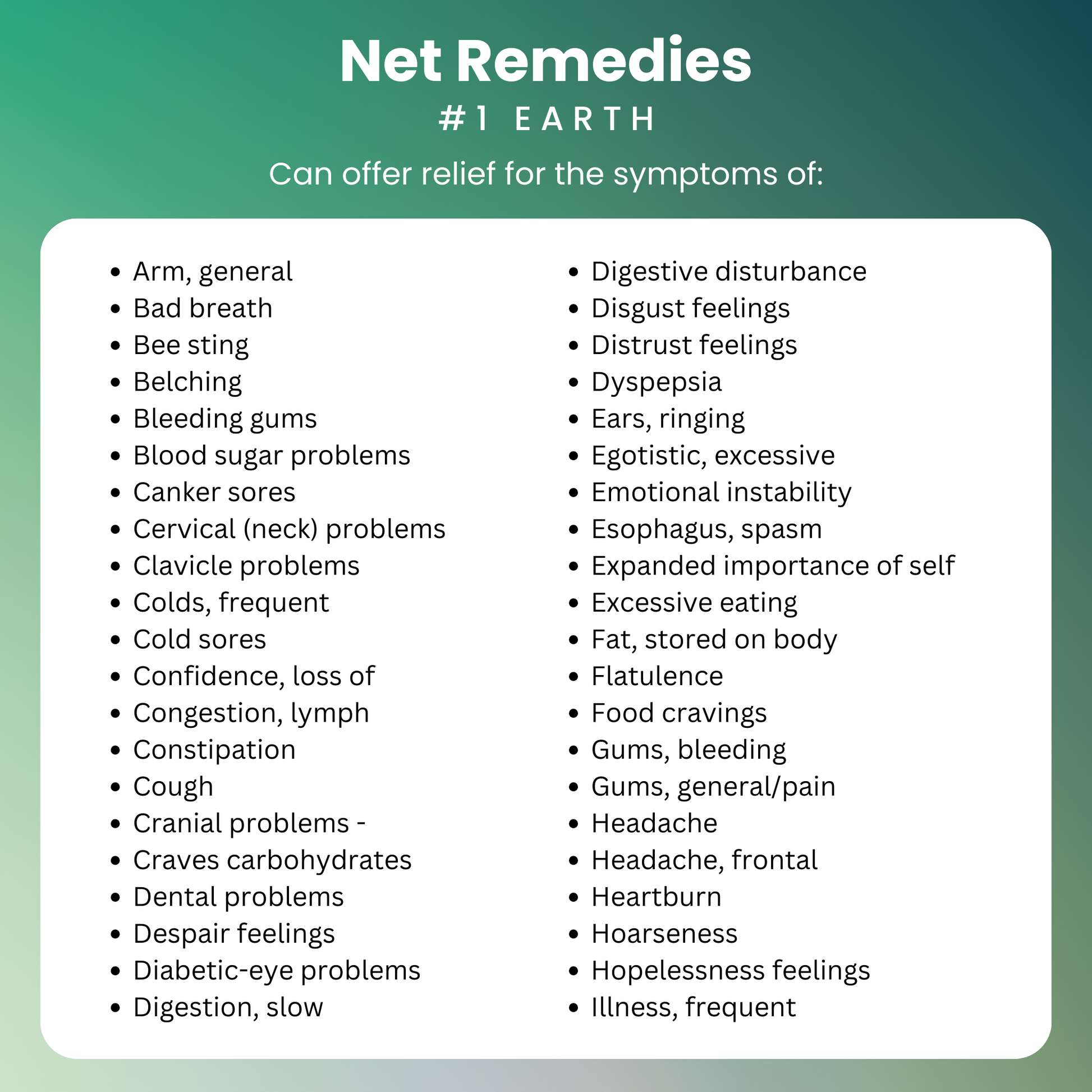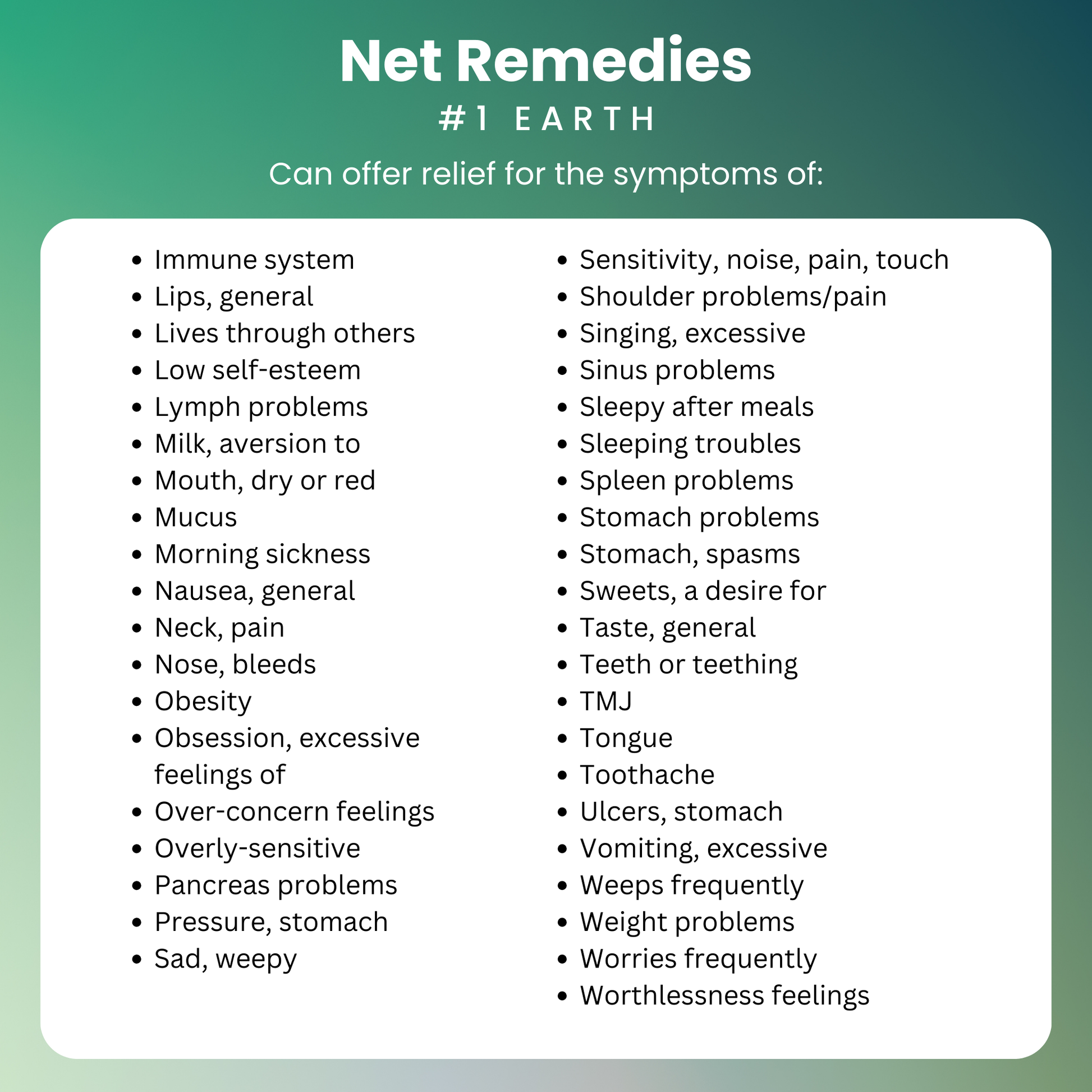 NET Remedy #1 EARTH can help with general problems in the mouth and digestive tract.