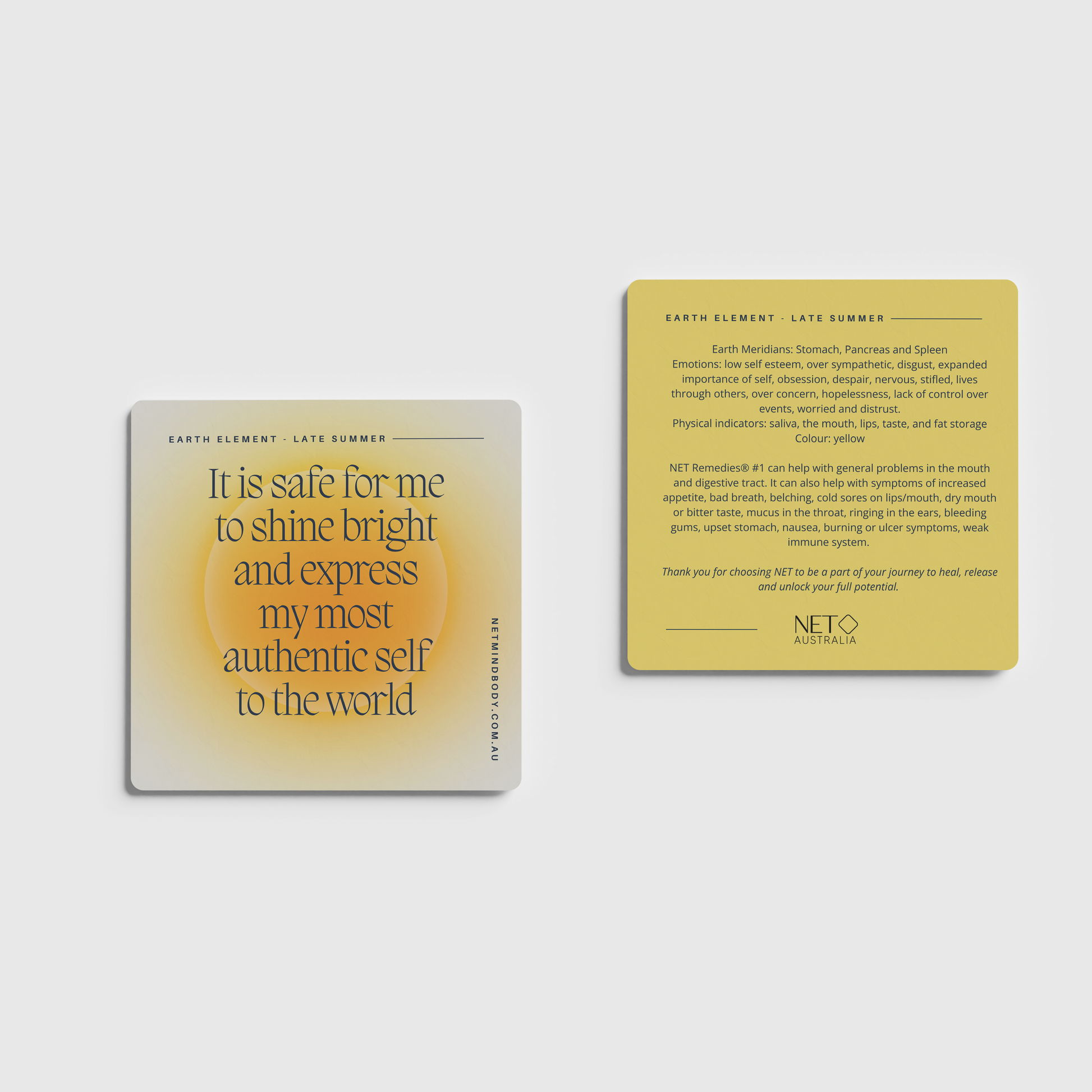 NET Remedy #1 EARTH is correlated with the acupuncturist’s ‘yellow’ Earth Element. The organ/meridians associated with the Earth Element are the Stomach, Pancreas and Spleen. Emotions associated with this element are low self esteem, over sympathetic, disgust, expanded importance of self, obsession, egotistic, despair, nervous, stifled, lives through others, over concern, hopelessness, lack of control over events, worried and distrust.