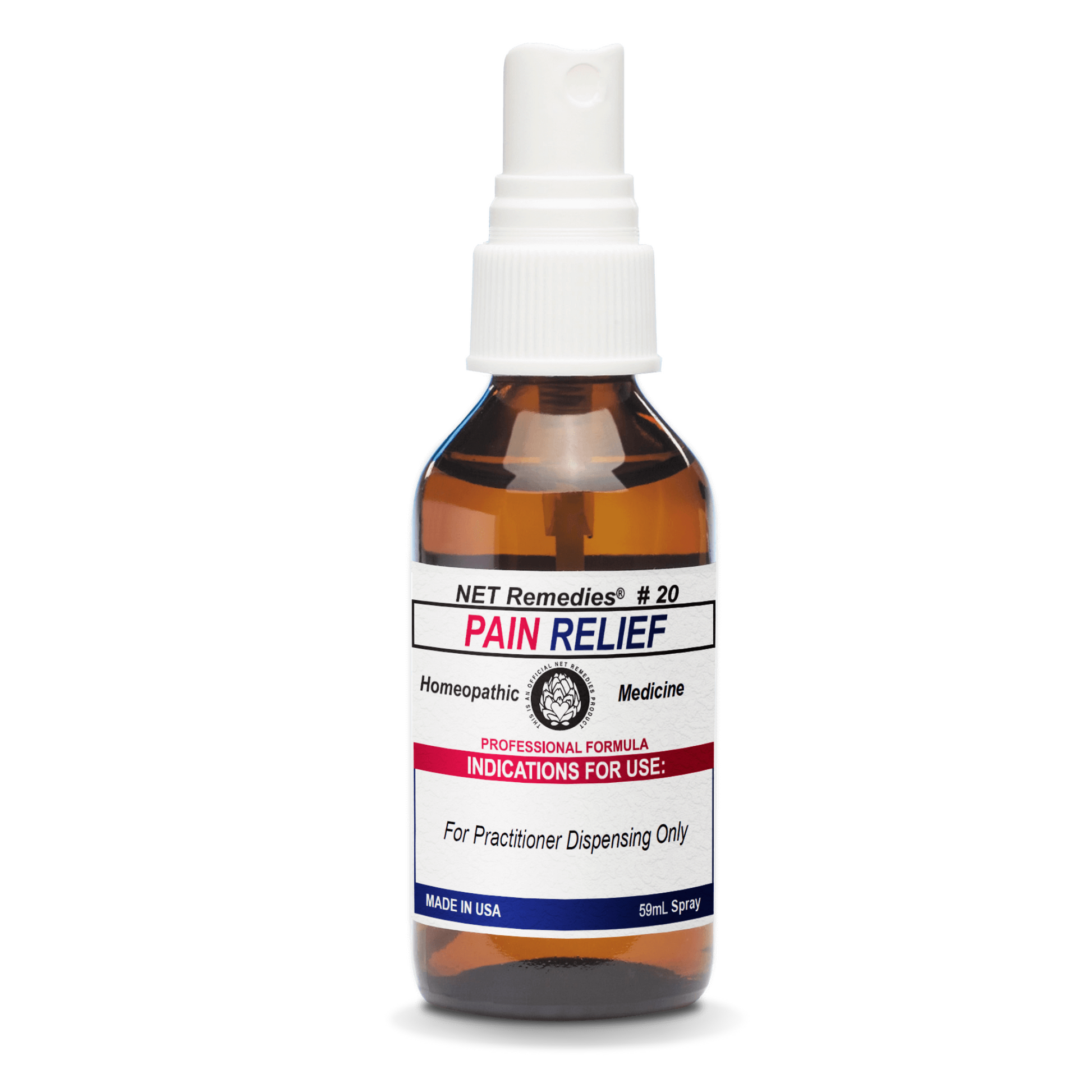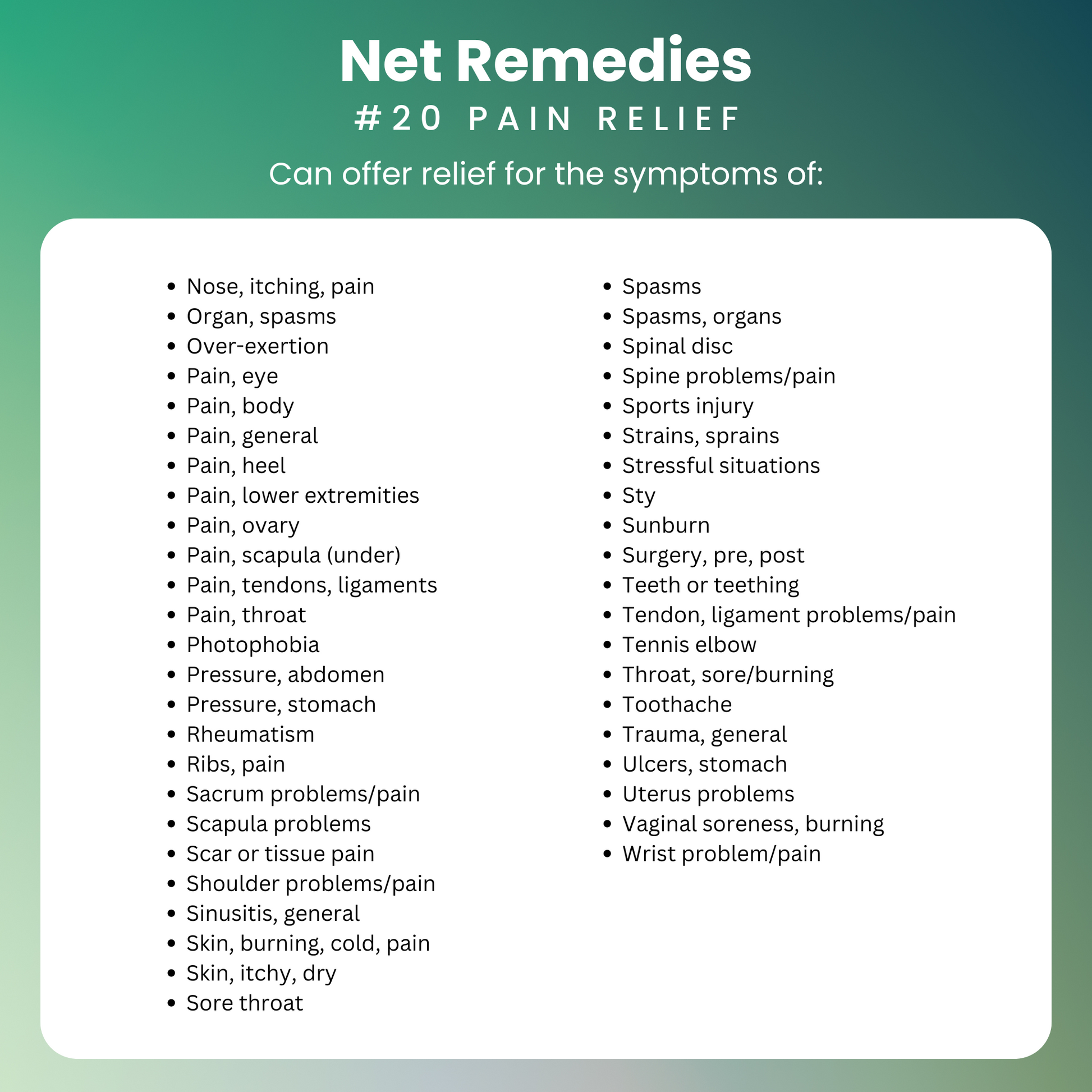 NET Remedies® #20 PAIN RELIEF is recommended for the relief of general pain, including symptoms related to joints, bones, muscles, minor bruises, spinal pain, pain support prior, during and after surgical or dental procedures, headache pain, pain due to overexertion, stings and minor irritations, discomfort related to menstrual symptoms and arthritis.