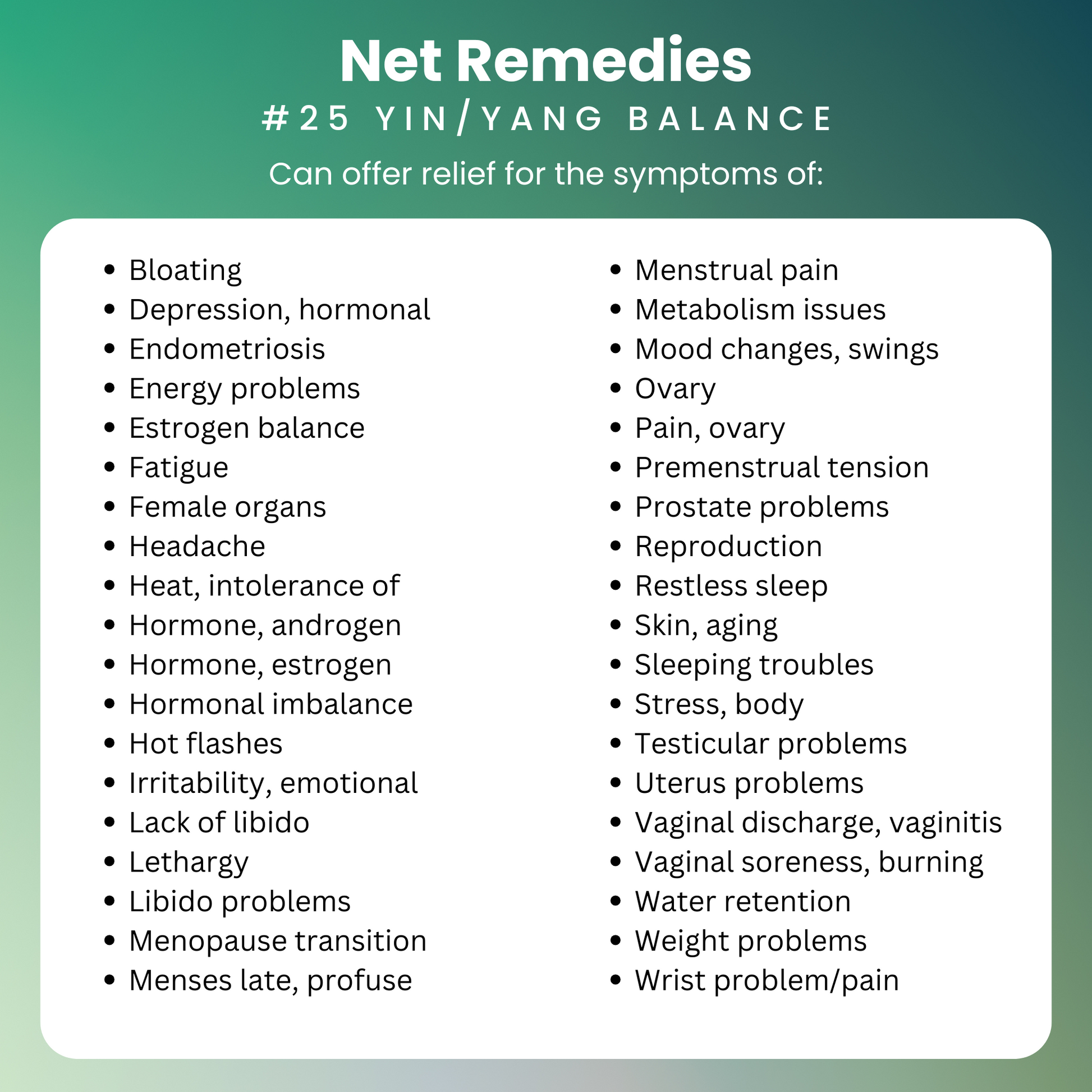 NET Remedies® #25 YIN/YANG Balance can also offer extra support for reduced sexual desire, changes in muscle mass, decreased body strength, hormonal related depression, increased body fat, loss of body hair, and general stress conditions.