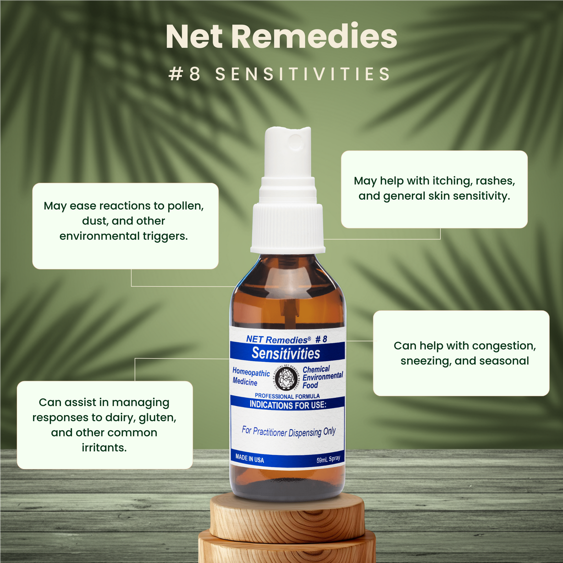 The #8 Sensitivities formula is used for any kind of sensitivity or reaction to any kind of food, environmental agent or substance. The effects of environmental pollution, chemical additives and pesticides are known to compromise our immune system. An inefficient immune system can manifest as sensitivities and allergy-type symptoms, as well as physical problems almost anywhere in the body! Physical indicators for this remedy are associated with all chronic problems that fail to resolve, concentration problems, over sensitivity, mood changes, headaches, depression, fatigue, learning problems, mental confusion and nervousness. Additionally, NET Remedies® #8 Sensitivities can offer relief for the symptoms of: anxiety, bloating, chemical hypersensitivity, colds, dizziness, food intolerances, gas, intense generalized itching, itchy or burning eyes, migraine headaches, sensitivity to summer heat, skin rashes, sore or sensitive skin, stuffy nose and sniffles.
