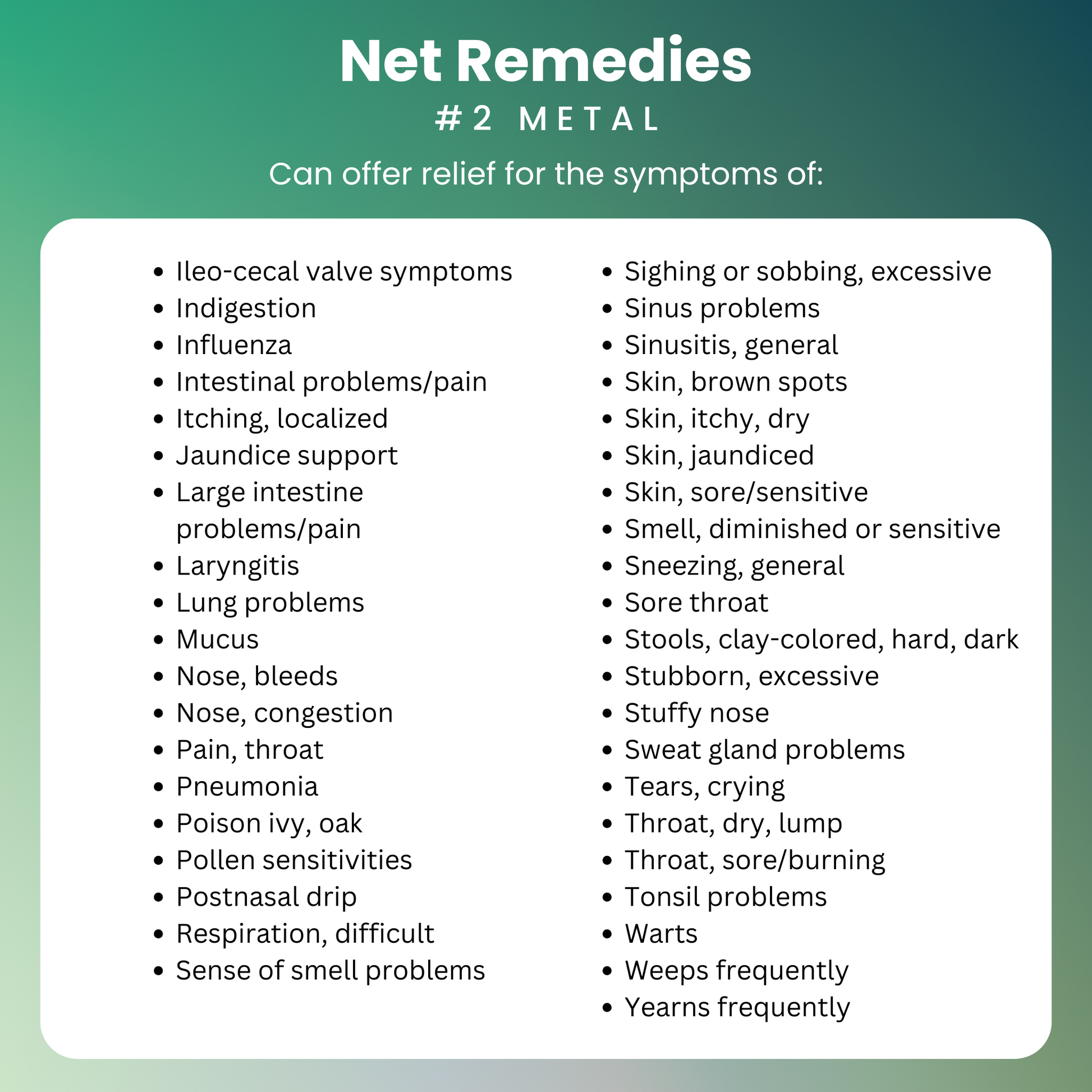 NET Remedies #2 METAL can help with Lung and Large Intestine conditions, as well as grief-type situations.