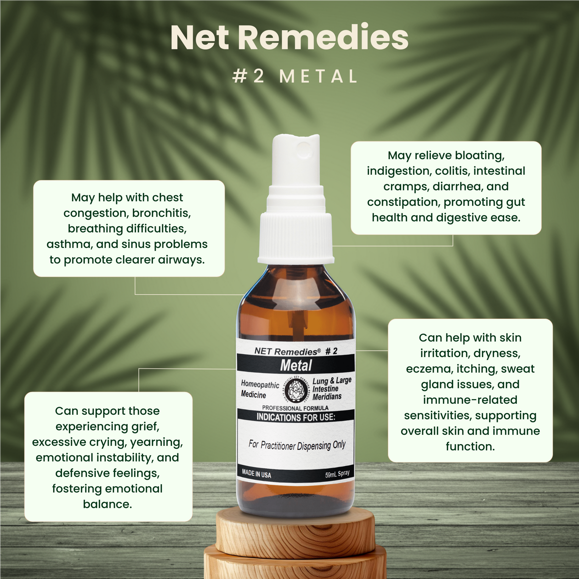 The #2 Metal formula corresponds with large intestine and lung-related conditions, as well as the family of emotions related to being dogmatic and having grief. Other physical indicators for this remedy are associated with the sense of smell, the nose, mucus, body hair and the skin. Also think of using this formula for sad situations like funerals, etc. Additionally, NET Remedies® #2 Metal can offer relief for the symptoms of: chest congestion, constriction, pressure, dry and spasmodic cough, gout, hearing problems, hoarseness, laryngitis, nose discharge or dryness, sense of smell problems, sensitivity to noise, pain, touch, slow comprehension, tearfulness, weeping and weak memory.